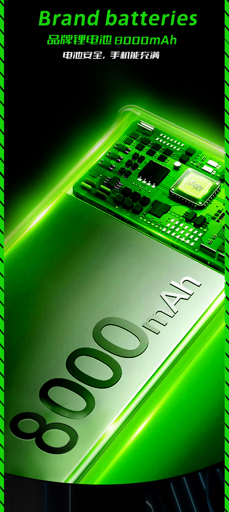 3、8000 毫安3A品牌锂电池(电池安全,手机能充满)